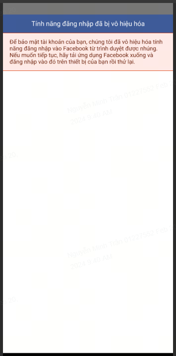 • Lưu ý: Nễu bạn đăng nhập mà có thông báo đăng nhập bị vô hiệu hóa như hình dưới thì có thể là trên app FB đang đăng nhập Facebook Fanpage chứ không phải FB cá nhân. Hoặc cần đăng nhập trên trình duyệt của điện thoại như Chrome hoặc Safari