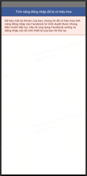 Lưu ý: Nễu bạn đăng nhập mà có thông báo đăng nhập bị vô hiệu hóa như hình dưới thì có thể là trên app FB đang đăng nhập Facebook Fanpage chứ không phải FB cá nhân. Hoặc cần đăng nhập trên trình duyệt của điện thoại như Chrome hoặc Safari